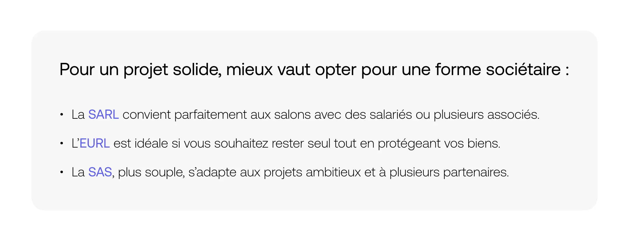Le statut influence non seulement la fiscalité mais aussi la gestion administrative de votre entreprise. C'est pourquoi choisir le bon statut juridique pour son salon de coiffure est une décision cruciale. Aujourd’hui, deux voies principales s’offrent à vous : exercer en entrepreneur individuel (statut unique) pour la simplicité, ou créer une société (SARL ou SAS) si vous visez une structure plus évolutive (associés, répartition du capital, développement).