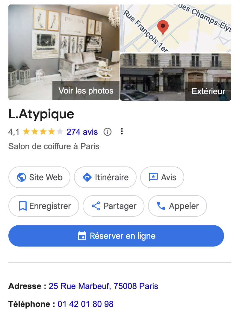 Grâce au référencement local, une fiche d’établissement Google bien optimisée permet d’apparaître au bon moment lorsque quelqu’un cherche un service beauté à proximité. Cette présence sur Google Maps augmente non seulement la fréquence des découvertes spontanées mais rassure aussi celles et ceux qui veulent vérifier la réputation avant de réserver. Et avec Planity, vous pouvez connecter votre prise de rendez-vous directement à votre fiche, simplifiant ainsi le parcours client de la découverte à la réservation.