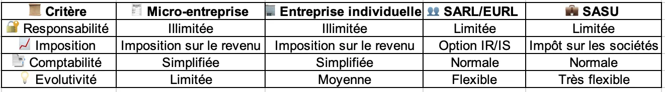 Tableau comparatif des statuts juridiques pour un institut de beauté